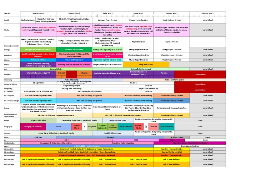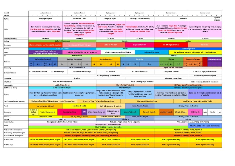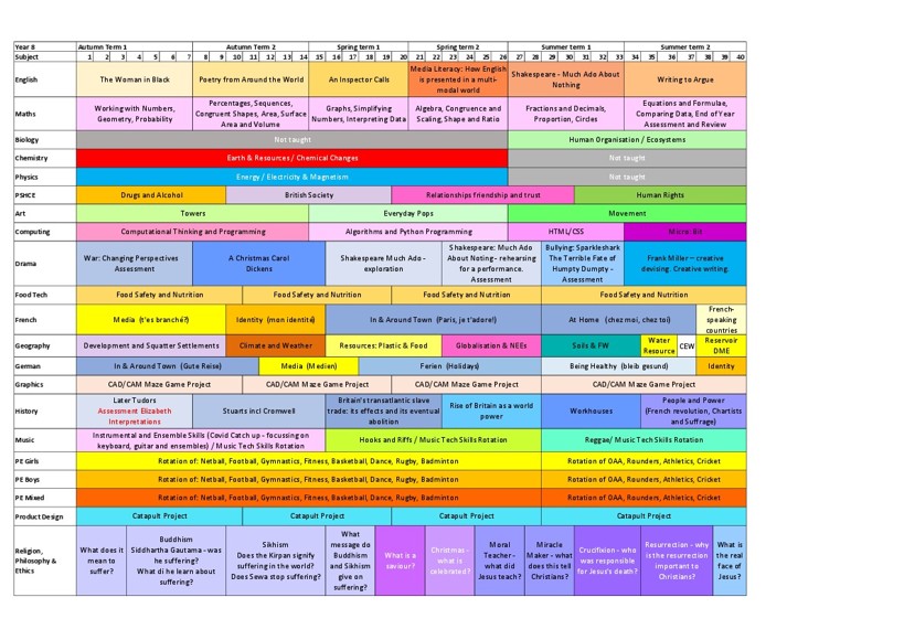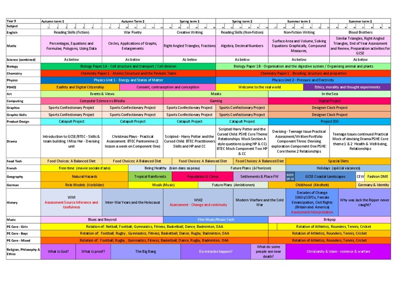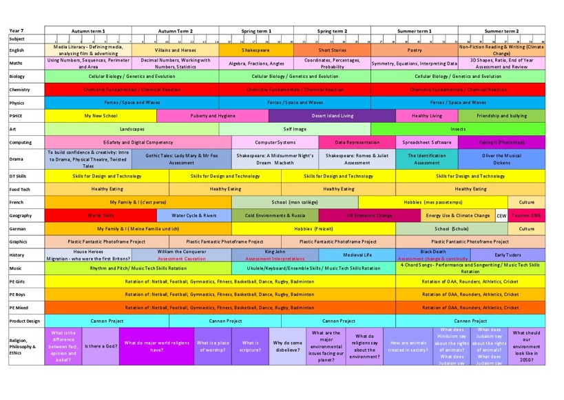 Each subject area has a detailed plan of what they teach and when they teach it; summaries can be found in the individual subject pages.