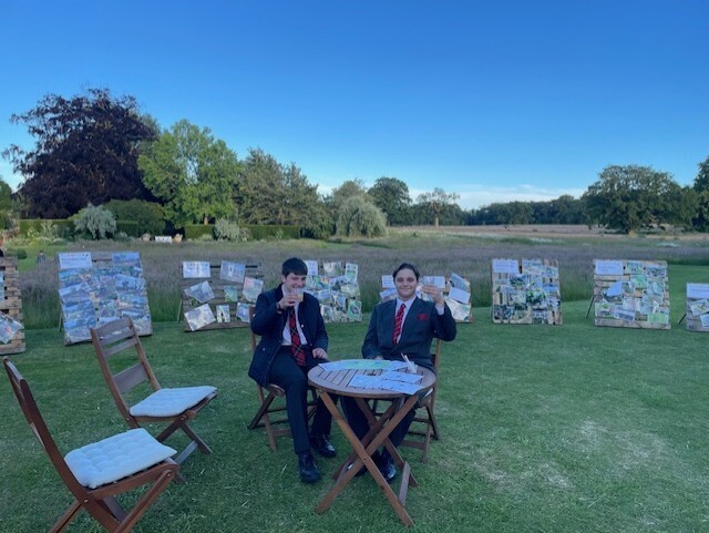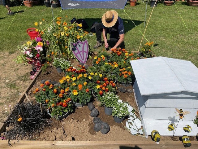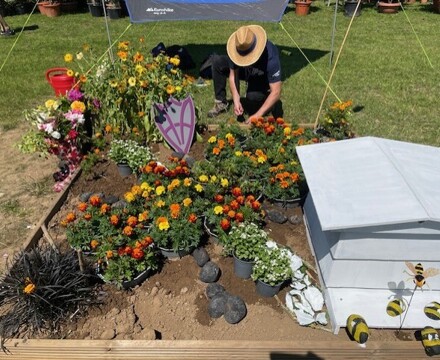 At the end of June we took our Bee Garden exhibit to the Royal Norfolk Show. Beth’s brilliant idea was to make a bee out of French Magnolias to represent the orange stripes, with black painted stones. Our concept was to bring as much of the school garden as possible to the show, and to demonstrate the bee friendly elements of a mixed garden with natural growing. We grew the marigolds in the hexagonal low plant pots so they could be transferred easily. We used white Agaratum, which is pale and gauzy, to suggest the bee’s wings, and added painted leaves and sticks for shape. We surrounded the bee with flowers that grow easily in Norfolk gardens and would attract bees. Mr Pickering built a model beehive from old packaging material. To display our roses and attract bees at the show, we put bouquets of them in wellies around the display with some foxgloves. The judges awarded us a Silver certificate. It was a lovely day out admiring gardens and enjoying all the exhibits at the Norfolk Show.