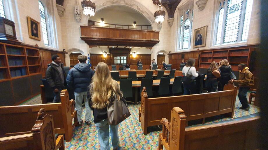 An imposing building opposite the Houses of Parliament, the Supreme Court of Justice was our next destination. Here we were invited to sit in the older style of Court One, where our guide explained how the court was set up and when the Supreme Court is used. Courtroom Two was a more modern room, here too we were allowed to sit in the seats of the judges and other members of the court. Some students had the opportunity to go to the viewing gallery of Court Three to witness a case being heard, while other members of the party enjoyed an exhibition.