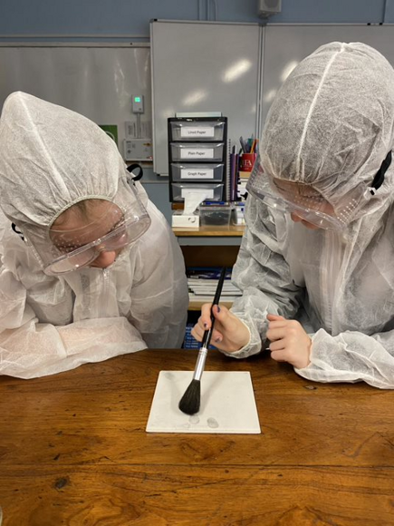 Posted on 1st Jul 2022Between November and February, the Science Faculty ran Forensics club. We looked different ways of dusting and lifting fingerprints, as well as carrying out several other forensic tests. We tested blood to find its blood group, performed chromatography on different samples of ink and used microscopes to investigate different fibres from mock crime scenes.