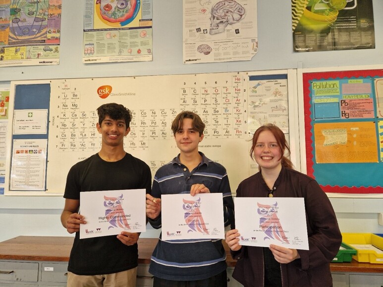 Year 13 A Level Biologists proudly displaying their awards – Left to right: Milan Sunil (received a Highly Commended award), Dylan Sharpe (received a Bronze award), Emma Jewson (received a Participation award).