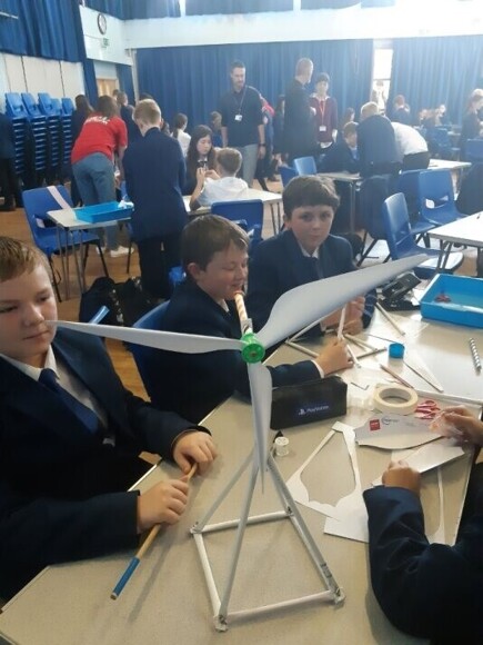 During the workshop, Year 7 students got the chance to work with real engineers to build their own wind turbines. Lots of teamwork was required to complete the challenge. The turbines were tested in front of an electric fan and the designs refined to improve the speed at which the turbines turned. Many groups completed the challenge showing excellent engineering and problem-solving skills.